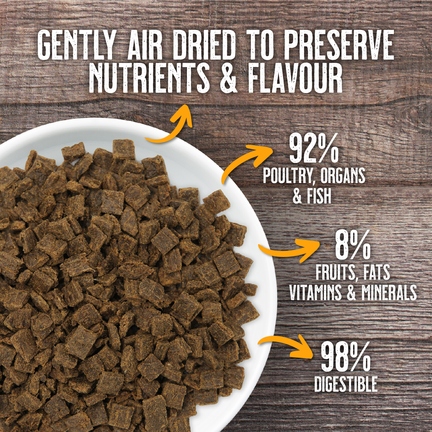 Inspired by raw diet, air drying is a preservation method that eliminates the moisture for microbial growth without the use of high temperatures. This method results in shelf-stable, highly palatable food, and preserves vital nutrients, offering nutrition similar to a raw diet.