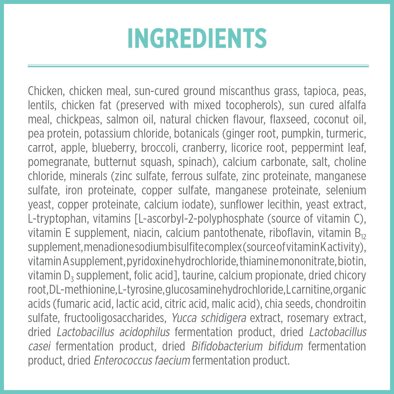 如系列的名稱一樣,配方中的每一款食材都是經過精心挑選。 市場上的大多數口腔健康配方都是使用纖維素作為非可溶性纖維的來源。纖維素是紙漿以及造紙工業的副產品;甚是是木片被化學消化以獲得存在於植物細胞壁中的纖維素。 Nutrience使用一種名為芒草的植物 — Miscanthus芒草是一種可持續種植的植物,因其非可溶性纖維被栽種着。芒草都會在添加到食物中之前先曬乾和磨碎。